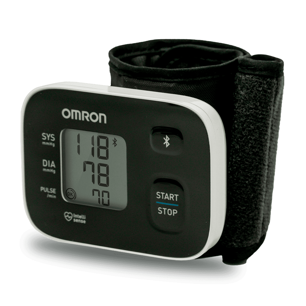 El monitor de muñeca HEM-6161T-E es la versión con Bluetooth del modelo RS2 (6161). Es compacto, silencioso y cómodo. Posee guía de ajuste del brazalete que ayuda a colocar el equipo correctamente para obtener mediciones más exactas, y almacena hasta 30 lecturas previas. Además, permite conectar el tensiómetro con el teléfono celular, para almacenar automáticamente las lecturas de presión en la app de Omron Connect.